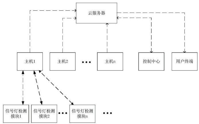 本研究提出的基于物联网的交通信号灯故障主动监测系统由云服务器、控制中心、用户终端、分布于各交通路口的主机群以及安装在信号灯上的检测模块共同构成,系统架构如图1 所示: