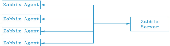 Zabbix 系统采用两种主要架构模式:基础架构采用 Client/Server模式,而分布式环境则支持 Client/Proxy/Server 或 Client/Node/Server 模式。在基础架构中,系统由 Zabbix Server 和 Zabbix Agent 组成,通过安装在客户端的 Agent 程序采集性能数据并传输至服务器,适用于单一数据中心的监控场景(如图 2-1 所示)。然而,这种基础架构存在监控范围有限的问题,难以应对多数据中心和资源池化的复杂需求,因此仍需进一步优化和扩展其架构设计。