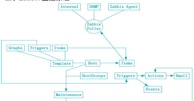Zabbix Server 可以通过 SNMP、Zabbix agent 等方法对远程服务器和网络设备进行状态监控和数据采集。Zabbix 架构按照:数据采集→配置管理 $$ 告警触发 $$ 通知响应”的逻辑拆解各组件和交互。在Zabbix 系统中被监控主机被抽象为主机 (host),系统采集服务器的信息被抽象为监控项 (item)。可以设置触发器 (triger) 监测监控项的返回值,当满足触发条件后执行相应的动作(action)。Zabbix 可以设置的动作包括执行脚本程序、发送报警信息和执行命令。以下为各个组件的功能: