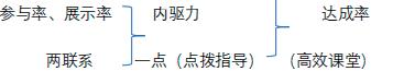 历史学科小组合作学习实效性探究问题的提出源于 2012 年以来我校在李树峰校长为首的校领导带领下进行的小班化课堂教学改革。我校小班化课堂教学改革的宗旨就是面向每一个学生,关注每一个学生的成长。为了实现这一宗旨我校小班化课堂教学改革采取的主要学习方式就是小组合作和探究学习 , 它符合当今倡导的转变学生学习方式,突出学生是学习主体的教学理念。我校小组合作学习的重点评价指标就是“三率”、“一点”、“一力”、“两联系”。“三率”指的是学生的参与率、展示率、达成率;“一点”指的是教师适时恰到好处的点拨指导 ;“一力”指的是充分调动学生的内驱力 ;“两联系”指的是课堂教学与现实生活联系,与时事政治相联系。“四项指标”彼此间的作用关系:
