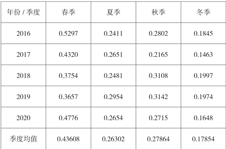 将上一步合成数据进行进一步处理得到季合成数据,进行四季气溶胶变化分析。同时制作出 2016-2020 年各年内各季度 AOD 均值变化统计表,如表1 所示。