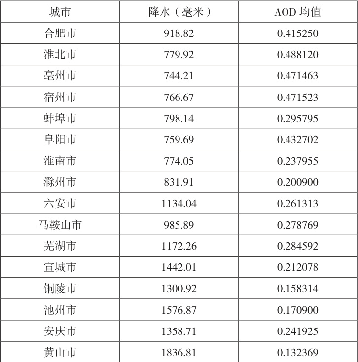 表2 安徽省各市多年平均降水量和 AOD 均值统计表