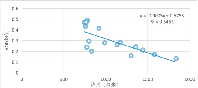 根据各市多年平均降水量和 AOD 均值拟合分析图的结果,R2=0.5452 ,该结果表明降水量和 AOD 呈中等的负相关。即降水量越高,气溶胶光学厚度越低。反之,则气溶胶光学厚度越高。
