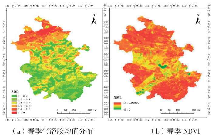 在各类植被指数中,归一化植被指数(Normalized DifferenceVegetative Index,NDVI)作为目前最常用的表征植被状态的指标,被用于植被因素分析。NDVI 是基于遥感影像波段的比值运算,其值为 -1⩽NDVI⩽1 ,正值表示有植被覆盖,且随覆盖度增大而增大。将气溶胶分布图与 NDVI 数据制作的专题图进行比较分析,如图 5所示。