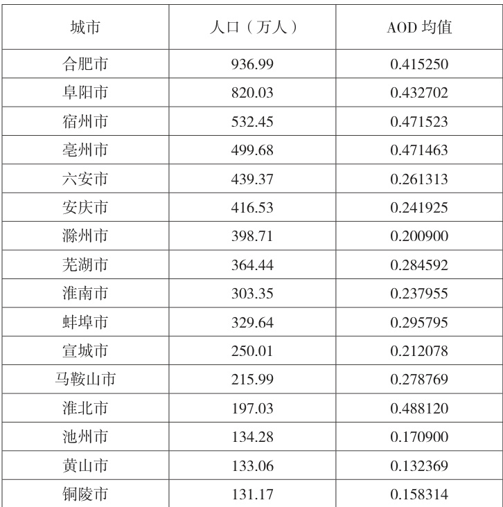 表3 安徽省各市人口和 AOD 均值统计表