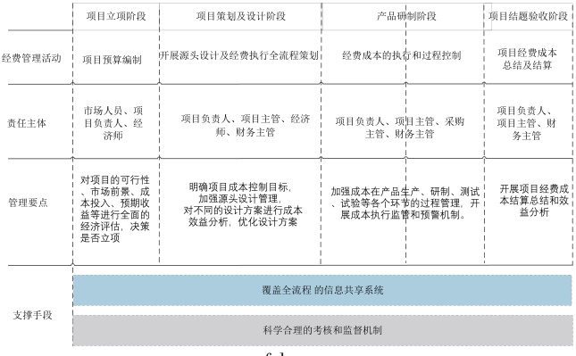 研发项目一般分为立项论证、策划及设计、产品研制和项目结题验收等阶段。每个阶段管理重要各有不同。要实现项目真正意义上的技术经济一体化,就得在每个管理流程中明确成本管理的相关管理要求,加强目标管理和过程控制。