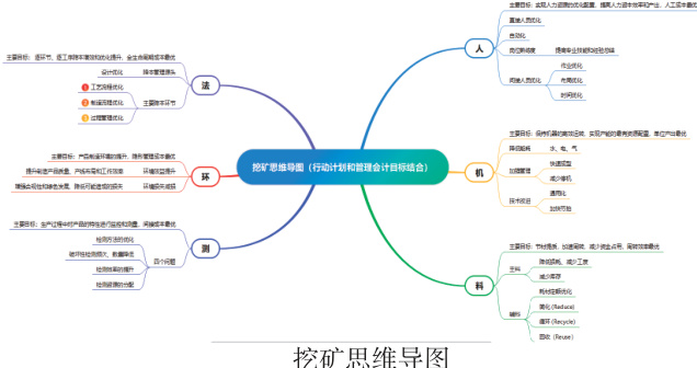 A 汽车零部件公司在成本管控的实践过程中,充分把思维导图和行动计划的管理工具结合运用起来,各部门(分子公司)根据集团要求按部门或科室组建挖矿小组,设置小组负责人,组织人,小组定期组织科室人员头脑风暴进行思维分析制作思维导图,根据思维导图制定行动计划。要求成员要要全面深入了解业务,便于挖矿过程中的进展跟踪与措施落实核查。挖矿规则、挖矿工具、挖矿实施方式,编制挖矿行动计划。