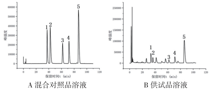 色谱柱:Venus IL MP C18 柱( 250mm×4.6mm , 5μm );流动相 A:乙腈,流动相 B: 0.03mol/L 二水合 磷酸二氢钠溶液;洗脱方式:梯度洗脱。梯度洗脱条件 0-45min 流动相 A:流动相 scriptstyleB=80:20 ;45-80min 流动相 A:流动相 B=76:24 ; 80-100min 流动相 A:流动相scriptstyleB=76:24 ;检测波长为 280nm ;流速 1mL/min ,进样量 20uL 。在本色谱条件下,延胡索中五种成分分离度良好。混合对照品溶液和供试品溶液的色谱图见图1。