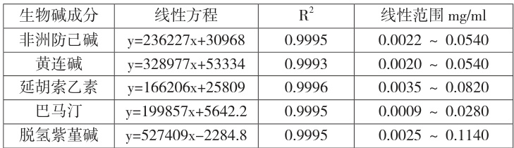 。以延胡索乙素为内参物,公式中 As 为 延胡索乙素峰面积,Cs 为延胡索乙素浓度,Ai 为待测成分峰面积,Ci 为待测成分浓度。精密吸取混合对照品溶液 2、5、10、15、20、 25μL 进样,以延胡索乙素为内参物, 采用多点校正法计算其余 4 种待测成分的相对校正因子分别为 0.464、0.333、0.295、0.450,RSD 均小于 3.00% 。