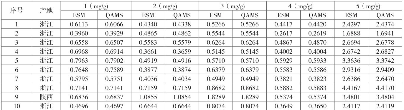 取 10 批延胡索药材样品适量制备供试品溶液,依上述色谱条件进样分析,记录各待测成分峰面积。采用外标法(the external standardmethod,ESM)计算各待测成分的含量,借助建立的相对校正因子计算各待测成分含量,待测成分质量浓度计算公式为: Ci=fs/i×∂[(cos ×Ai)/As] 公式中As 为内参物延胡索乙素峰面积,Cs 为内参物浓度,Ai 为待测成分峰面积,Ci 为待测成分浓度,fs/i 为待测成分与内参物相对校正因子。通过QAMS和ESM定量测定结果高度相似,结果见表6。