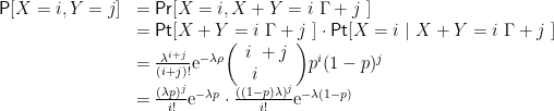 所以,随机变量 X 服从参数为 λp 的泊松分布,随机变量 Y 服从参数为 λ(1-p) 的泊松分布。此外,由于,对于任意的 i,j≥0