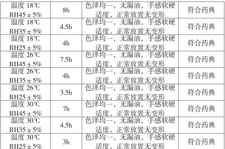 考察干燥温湿度条件对软胶囊质量的影响,结果见表5、表6、表7。