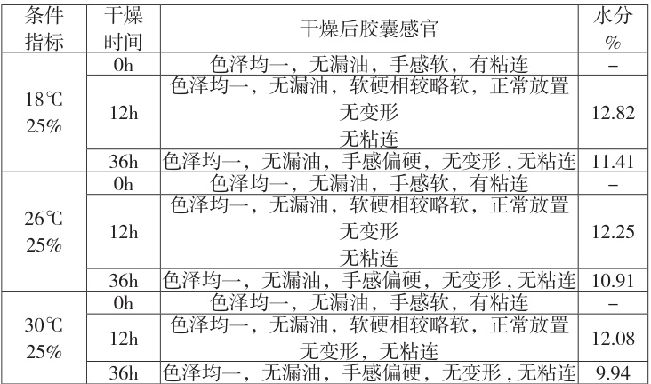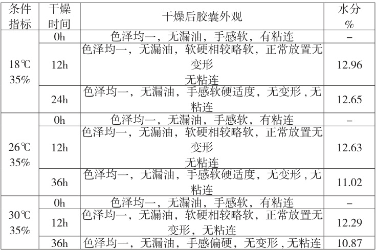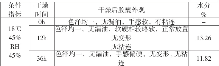 干燥过程是把定型后的软胶囊丸粒持续干燥的过程,使软胶囊皮水分降低,以便最终软胶囊的使用和贮藏。在对软胶囊进行干燥时,较高的温度更利于干燥,结合 GMP 车间及生产设备要求,选择18°C~30∘C 作为干燥温度;较低的湿度更利于干燥,随着干燥温度的升高和干燥时间的延长,软胶囊崩解时间越来越短 [18],选择湿度15% 、 25% 、 35% 、 45% ( ±5 )进行考察,以胶囊外观、囊皮水分(胶囊软硬度适度时开始检查,并用快速水分测定仪检测软胶囊皮的水分含量)为考察评价指标,评价环境条件对干燥的影响。
