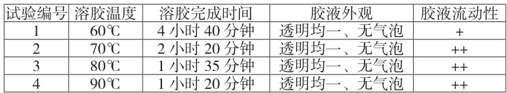 试验结果显示,试验 1 明胶溶解缓慢,溶胶时间较长,工作效率较低,胶液外观合格,流动性一般;试验2 和试验3,溶胶时间适中,胶液外观合格,胶液流动性较好,试验 4 溶胶时间无明显减少,能耗相对较高,胶液外观合格,胶液流动性较好。综合考虑胶液质量,生产效率和能耗等因素,试验 2、3 较为合适,因此选择温度控制在