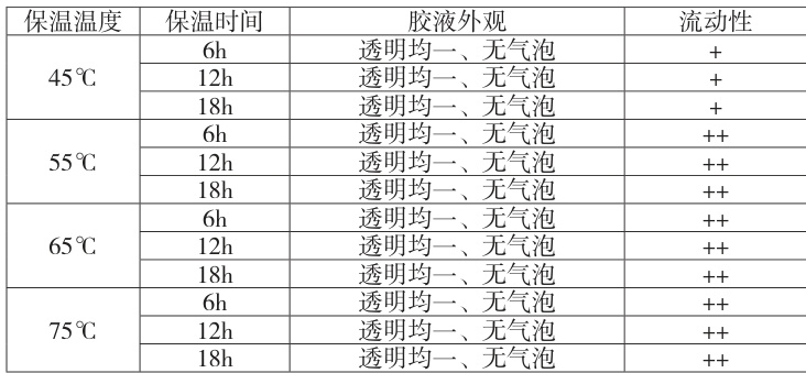 试验结果显示,各温度保温后,胶液外观均符合要求。 45°C 保温时,胶液流动性一般; 55qC 、 65°C 、 75∘C 保温时,胶液流动性较好, 75% 保温能耗较高。综合考虑胶液质量,生产效率和能耗等因素,55qC~65qC 保温较为合适,因此选择保温温度控制在