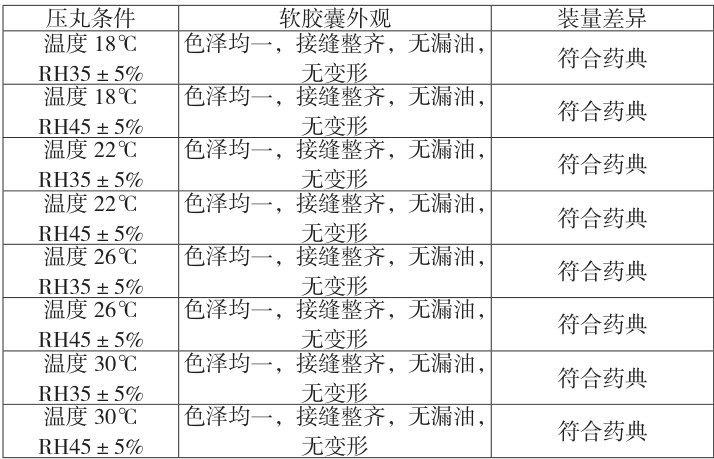 压丸是将原料内容物经过压丸设备压制成胶囊,是软胶囊的填充过程。在压丸工艺过程中环境条件(温度和湿度)对产品有一定的影响,所以对环境条件进行考察。 湿度过高不利于软胶囊的成型,过低的湿度则增加除湿设备能耗,因此选择 RH35±5% 、 RH45±5% 进行考察;温度在 18∘C~30°C 之间选择 18°C 、 22% 、 24∘C 、 30% 四个温度点进行考察,以压丸后软胶囊外观,和装量差异为考察指标,评价环境条件对压丸工艺过程的影响。