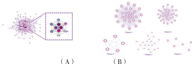 通过将筛选出的交集靶点导入 STRING 网络分析平台,生成 TSV文件,并将其导入 Cytoscape 3.10.1 软件,构建了 PPI 网络。该网络包含 214 个节点和 2958 条边。使用 CytoHubba 插件并基于 Degree 算法,筛选出得分排名前 10 的核心基因,并进行了可视化展示,如图 2A所示。利用 MCODE 插件分析 PPI 网络中的关键模块,共识别出 6 个Cluster 模块。由于最后一个Cluster 的节点数量少于4,未进行可视化展示,仅展示了5 个Cluster,详见图 2B。
