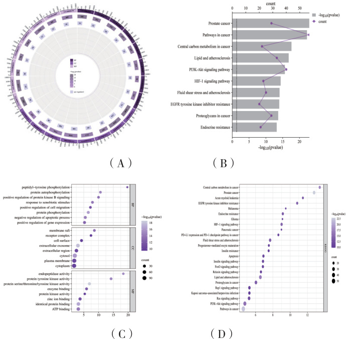 通过 DAVID 数据库对 222 个交集靶点进行 GO 和 KEGG 富集分析。在 P<0.05 的标准下,共筛选出 442 个 GO 富集项,其中包括245 个 BP、79 个 CC 和 118 个 MF。GO 分析揭示 BP 主要涉及 proteinphosphorylation 等;CC 主要涉及 extracellular exosome、cytosol 等;MF则主要涉及 protein serine/threonine/tyrosine kinase activity 等。通过富集圆圈图展示了 BP、CC、MF 中排名前 8 的条目,见图 3A。在 KEGG富集分析中,共鉴定到 157 条通路,包括 Prostate cancer、Pathways incancer、Central carbon metabolism in cancer 等(见图 3B)。在卡格列净治疗DR 的通路机制中,可能与PI3K-Akt 信号通路、HIF-1 信号通路、AGE-RAGE 信号通路等相关。根据 P 值对富集结果进行排序,并绘制了相应的气泡图(图3C、图 3D)。