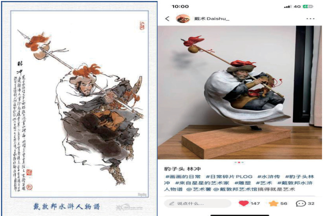 (三)应物象形:释义为 “顺应物象之本态而描绘其形”,然而在西方潮玩超写实主义的技术霸权下,这一原则常被简化为对物理表象的精确复制。应物象形不等于物象仿真,而是通过 “意象造型”实现 “以形写神、离形得似”的东方美学升华。这种转译超越“中国元素”的表层应用,直指徐复观所言 “中国艺术精神的生命性”。以笔者结合戴敦邦先生《水浒人物谱》所创作的《水浒系列》为例,作品作为“新潮玩”理念的具体实验案例与传统的手办不同,不再追求精致的细节,而是将笔墨韵味放在作品的首位进行创作,其核心突破在于对“谢赫六法”美学原则的深度转译与立体化重构,从而实现了从传统绘画平面到当代潮玩立体的范式跃迁。它并非对戴敦邦先生精妙线描的机械复制,而是敏锐捕捉并升华了其作品内在的“东方美学本体论”精髓,通过三维空间的再造,生动诠释了六法在现代设计语境下的生命力。具体而言,其创新体现在对“气韵生动”、“气骨法用笔”及“应物象形”三大核心原则的创造性转化上。《水浒系列》的创作实践,是“新潮玩”理论中“美学转译”路径的完美注脚。它有力地证明了:解码文化基因的有效性 ,通过对戴敦邦作品这一蕴含深厚“集体无意识”的艺术瑰宝进行解码。东方美学原则并非作为符号贴图,而是作为方法论和本体语言,系统性地转译为三维设计的核心范式,实现了从“中国元素”到“东方美学本体论”的升华。这种创作本身就是对“文化生产关系的范式革新”的践行。它要求创作者具备深厚的传统美学修养和当代设计转化能力,不再是简单的代工执行者,而是文化基因的解码者与转译者,为构建“开源 IP 协作生态”中“创作者转译”环节提供了高价值的示范样本。