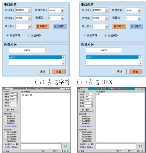 通过单选按钮对发送数据的格式进行转换,若发送的数据按字符发送,则串口助手收到的数据如图 1(c)所示;若发送的数据按HEX 发送,则串口助手收到的数据如图1(d)所示。