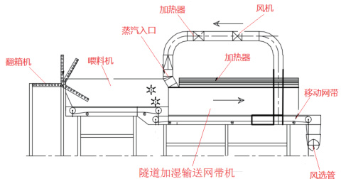 为了满足烟支加温回潮及自动进料的工艺需求,用一种隧道加湿输送网带机来完成烟支的加温回潮及上料的工艺方案,该方案主要由翻箱机、喂料机以及隧道加湿输送网带机组成。