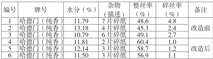 通过改进残烟烟支上料,改造后实现了缓存均匀供料,残烟烟支回潮系统改造后,回潮稳定可靠,满足实际需要,无“水渍烟”产生;烟纸和烟丝分离振筛修复破损的筛网后,减少了设备区域扬尘量,改善了工作环境。改造后满足残烟处理系统控制功能需要、运行稳定、安全、可靠。改造后回收烟丝整丝率 ⩾50% ,碎丝率 ⩽2% ,系统运行稳定性显著增强。