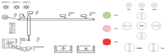 为使操作方便,为大小球分拣设计控制面板如图 2, 右上为原点、无球与急停的显示灯;中间为手动操作时机械手的控制按钮,控制其上下左右与电磁铁的吸放球,由长按的形式对机械手进行操控,当松手时运动立即停止;右下为模式选择旋钮,分别为循环与单周期的控制旋钮、自动与手动的控制旋钮;左侧从上至下为启动按钮、停止按钮、急停按钮,急停按钮设置为鲜艳显眼的红色确保让操作人员能在紧急时刻立即寻找到按钮确保设备与人员安全。