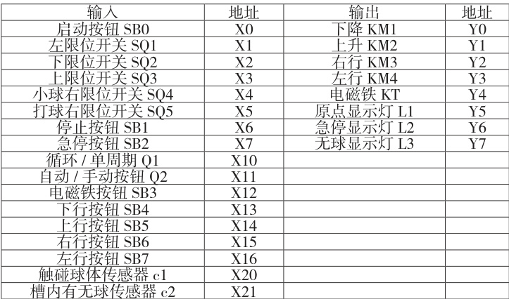 输出分析:电磁铁;机械手的上下左右行对应电机(正、反转)线圈;原点、急停、无球的显示灯。共8 个输出。