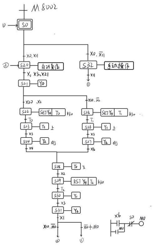按照控制要求,该系统的顺序功能图在判断自动还是手动时有一个分支点;在判断抓住的是大小球处应有一个选择性分支点。两个分支分别完成大小球的吸球、上行、右行至右限、下降等一系列动作,并将右限处设为汇合点。然后再释放、上升、左移到原点;回到原点根据是否为循环或是否按下停止按钮也有一个选择性分支点。具体的功能功能图如图 5 所示,且由于停止按钮为点动,所以采用一个辅助继电器M0 作为其的保持器。