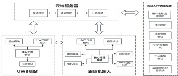 UWB 基站主要作用是实现基站与云端服务器的无线通信功能和控制 UWB 定位模块功能;跟随机器人主要功能是在全局定位模式和分布式定位模式两种不同模式下,获取跟随机器人自身的位置并与系统外部设备进行通信;UWB 标签主要是实现目标跟踪的装置,可选择卡扣 \ 吸磁 \ 手环等多种佩戴方式;所述跟随系统 APP 功能模块包含:用户注册\ 登录、定位\ 搜索、预约、扫码租赁、订单查询\ 支付、订单评价、故障报修等模块。