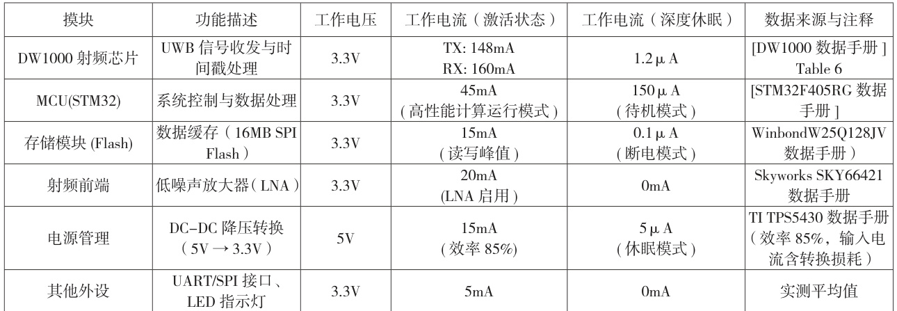 基于 DW1000 的 UWB 基站(仅由 DW1000 芯片、MCU、存储模块及外围模块组成)正常收发和深度休眠两种状态下的电气参数(根据DW1000 数据手册、STM32 系列MCU 规格书及行业实测数据),如表1 所示: