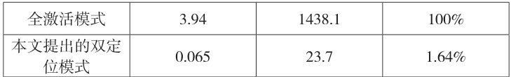 对比分析得出全激活模式和本文提出的节能模式能耗效果,如表 2所示,可知在 400m×200m 单层室内场景下全激活模式下,所有 190个基站持续工作,日能耗高达 3.94kWh ,年能耗更是达到了 1438.1kWh ,占据了 100% 的能耗比例。而相比之下,本文提出的双定位模式仅需要 3 个基站处于激活状态,其余 187 个基站均处于深度休眠状态,日能耗骤降至 0.065kWh ,年能耗也仅为 23.7kWh ,能耗占比仅为 1.64% ,日年节能倍数是全激活模式下的 61 倍。数据对比强烈地突出了双定位模式在节能方面的巨大优势。