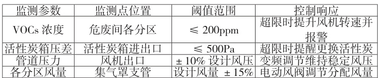 二是设备状态联动控制,将风机、电动风阀、活性炭箱压差计等设备通过信号线路连接,建立逻辑控制关系(如表 2)。系统启动时,先开启风机空载运行 30s,待管道形成负压后再逐步打开各区域风阀;当活性炭箱压差超过设定阈值(≥ 500Pa)时,触发更换提醒并记录运行时间,便于计划性维护。三是异常情况响应,在危废间内布设 VOCs 浓度传感器与温湿度传感器,当浓度超过限值(如VOCs⩾200ppm )或温度异常升高时,自动提升风机转速至最大风量,并启动声光报警,同时将数据上传至中控系统,保障及时干预 [3]。