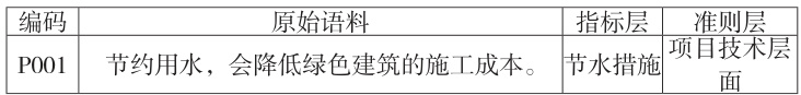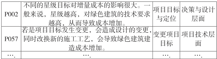 以编号 P001 和 P057 为例,对语句“节约用水,会降低绿色建筑的施工成本”和“项目目标发生变化会导致绿色建筑成本的增加”进行拆分,依次得到“节约水资源”和“项目目标发生变更”。同理对所有样本进行拆分,合并类似表述,得到 P001 和 P057 的指标层“节水措施”和“变更项目目标”;进行分类总结,得到 P001 和 P057 的准则层“项目技术层面”。