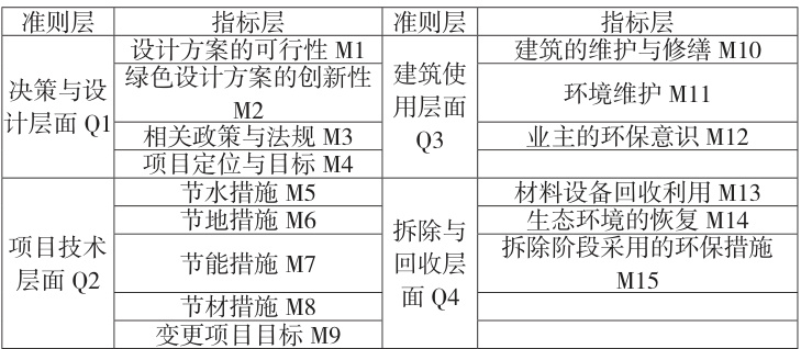 饱和度检验指在新资料下,不能再产生新的类属或已有类属没有新的属性再出现时(即为“饱和”),对一个主题的访谈结束。本文预留 23 份样本用于饱和度检验,通过上述编码方式进行解析,并与已获得的类属进行对比,未发现新的概念及属性,表明评价指标通过饱和度检验,样本表现为“饱和”。因此,本文构建包含 4 个准则层和15 个指标层的绿色建筑增量成本影响因素评价指标体系(表2)。