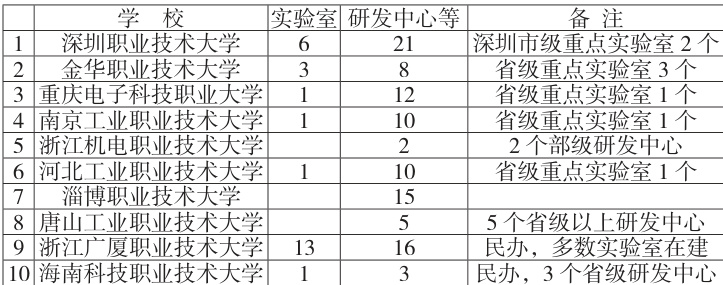以上只是根据这 10 所职业技术大学公开发布的相关信息,粗略统计而成。这里存在许多不确定因素。一是各学校对实验室、研发中心的理解和界定不一致;二是各学校发布信息的时间不一致,有些学校没有及时更新信息;三是很难找到权威的统计数据。无论这些数据是多么粗疏,但这 10 所职业技术大学的“实验偏好趋向”是显而易见的。