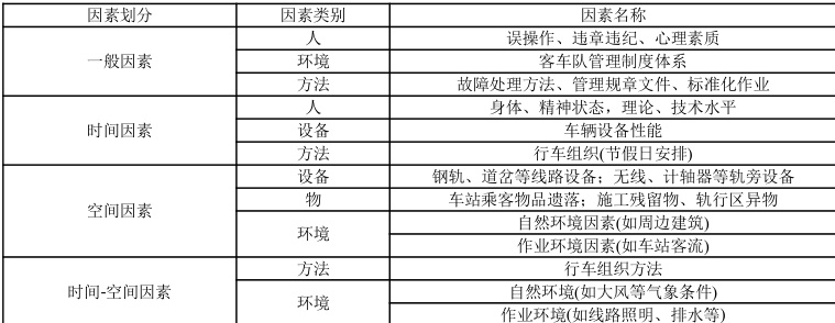 在工程项目质量控制领域,4M1E 法作为识别与分析施工质量影响因素的常用手段,能为工程质量管控提供数据支撑。将其引入地铁司机岗位作业风险分析中,结合该岗位作业特性及相关研究可知,影响司机岗位作业的因素主要集中于人、物、设备、方法和环境五大维度。