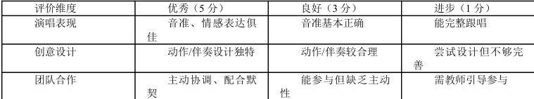 设计包含“演唱表现”“创意设计”“团队合作”等维度的评价量规(如表1),关注学生进步而非单纯结果。