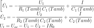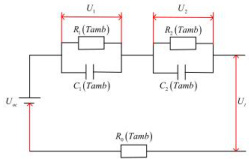 在DP 等效电路模型,Uoc为开路电压,R0(Tamb)为欧姆内阻,R1(Tamb)与C1(Tamb)为电化学极化电阻与电容,R2(Tamb)与C2(Tamb)为浓度差极化电阻与电容。DP 等效电路模型终端电压计算公式如1-1 所示:
