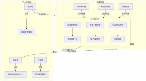 依据现有的教育信息资源[12] ,得出运动数据量化后可以提高运动表现和运动效果。可穿戴设备使训练负荷误差率降至<5%[13] 。所以利用人工智能,AI 算法,高校应当构建“体育教 育数据平台 ”,实时检测学生体育锻炼数据[14]。例如步道乐跑中通过采集心率、运动动作 轨迹、步频等生物力学数据,更好的进行风险预警,AI 可自动识别运动姿态错误(摆臂姿 势不对、膝盖内扣),推动纠错视频给学生端口,并以锻炼数据情况生成针对性的运动处方, (如肥胖学生减脂方案)。具体内容如图 3 所示。