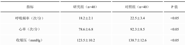 研究组呼吸(18.2±2.1vs22.5±3.4 次/分)、心率(78.6±6.8vs92.3±8.5 次/分)、血压(123.5±10.2vs138.7±12.6mmHg)均优于对照组(均 P<0.05)。