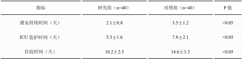 研究组谵妄持续时间 (2.1±0.8vs3.5±1.2 天)、ICU 监护时间 (5.3±1.6vs7.8±2.1 天)、住院时间 (10.2±2 .5vs14.6±3.3 天)均更短(均 P<0.05)。