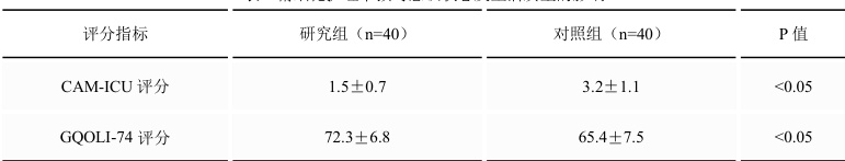研究组 CAM-ICU 评分( (1.5±0.7vs3.2±1.1) 更低,GQOLI-74 评分(72.3±6.8vs65.4±7.5)更高(均 P<0.05)。