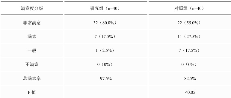 研究组总满意率 97.5% (39/40)显著高于对照组 82.5% (33/40)( x2=5.012 ,P<0.05)。