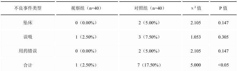 (1)不良事件发生率:包括坠床、误吸、用药错误等;(2)患者满意度:采用Likert5 级评分法评估;(3)护理质量评分:由质控小组从基础护理、专科操作、应急处理三个维度进行百分制评价;(4)护士行为改善情况:包括手卫生依从性、风险评估完整性及交接班规范率。所有指标均采用标准化评估工具进行测量。