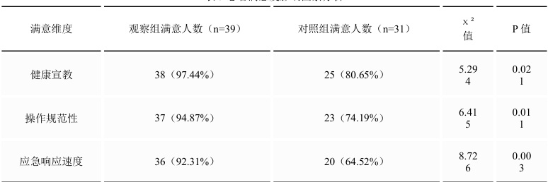 对照组采用常规护理管理,包括基础生命体征监测、用药指导及健康宣教等;观察组在常规护理基础上实施风险管理模式,具体措施包括:(1)成立风险管理小组,定期分析科室护理风险点并制定针对性预案;(2)规范呼吸专科操作流程(如氧疗管理、雾化吸入、吸痰操作)并进行标准化培训;(3)建立不良事件报告及反馈系统,实行24 小时动态风险评估;(4)加强护患沟通,采用可视化健康教育材料。