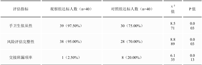 手卫生依从性( (97.50%vs75.00%) )、风险评估完整性(95.00%vs70.00%)显著提升(P 均<0.05)。