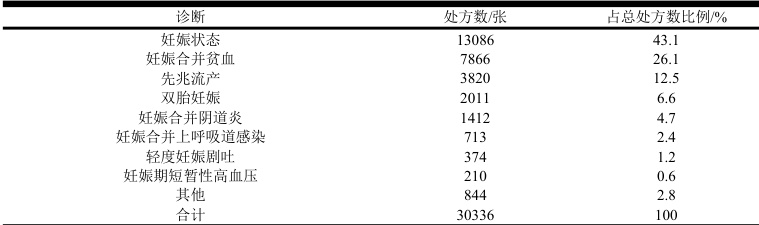 共抽取 30336 张处方,患者年龄在 19 岁-38 岁,其中,主要集中在 22 岁-28 岁,占产科患者的 53.1% (16102/30336)。处方诊断最多为妊娠状态,其次是妊娠合并贫血,详细情况见表1。