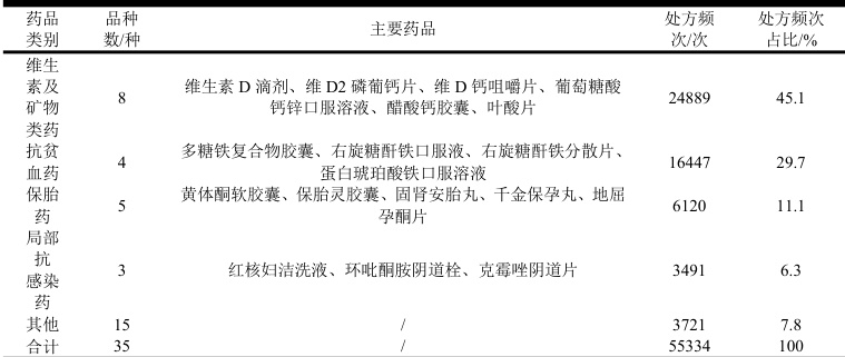 在30336 张处方中所涉及35 种药品(诊断用药口服葡萄糖粉除外),处方频次较高的为维生素及矿物类药,其次为抗贫血药,详见表2。