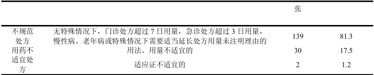 3.3 不合理用药处方分析在30336 张处方中,不合理处方171 张,不合理率 5.6‰ 。具体存在问题详见表4。